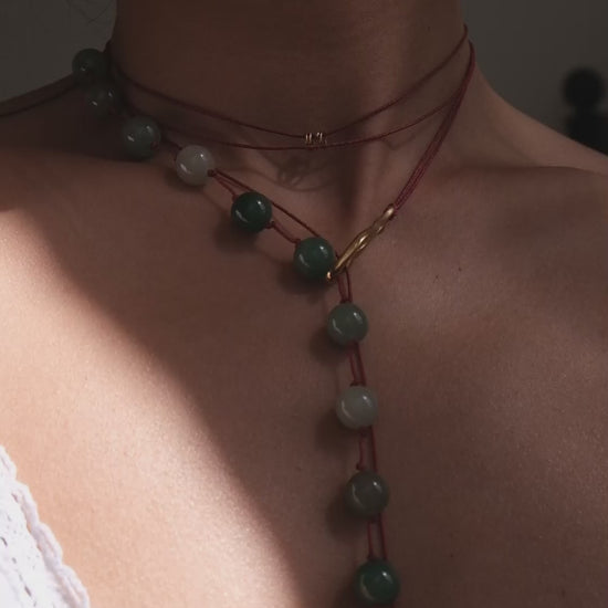 This is the mixed green edition of the Pomegranate Necklace, featuring aventurine beads in varying shades of green while retaining the original red strings for a touch of traditional Asian elegance.